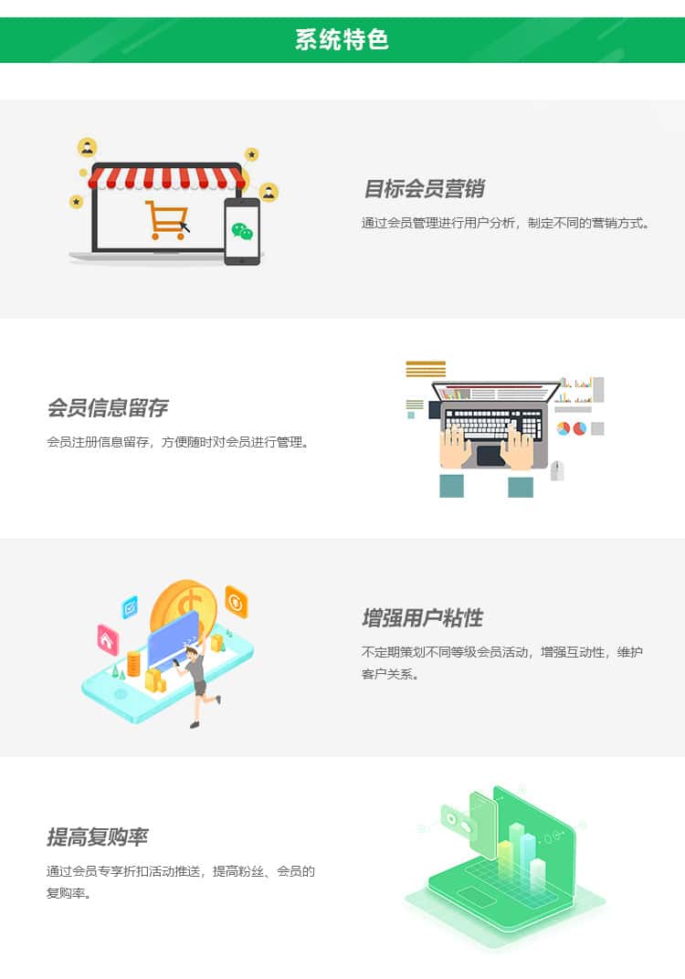 会员等级商城是一款基于微信开发、致力于会员等级折扣的商城系统。企业以会员制形式发展顾客,利用合理的会员积分和等级制度,并提供差别化的优惠折扣,提高顾客忠诚度和回头率,增加企业长期利润。
